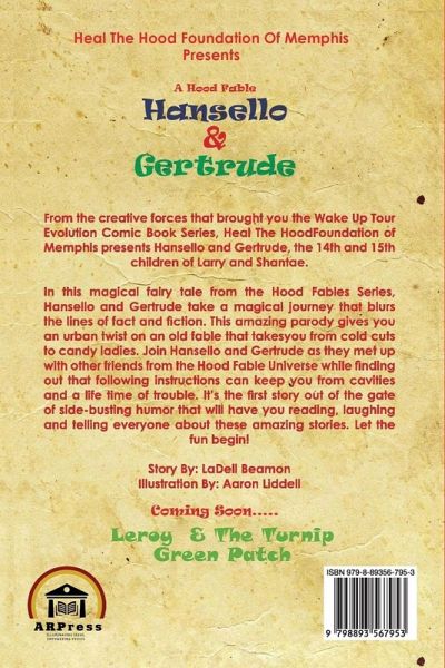 From Heal The Hood Foundation of Memphis , the creative forces that brought you the Wake Up Tour and the Evolution Comic Book Series, presents Hansello and Gertrude, the 13th and 14th children of Larry and Shantae.In this magical fairy tale from the Hood Fables Series, Hansello and Gertrude take a magical journey that blurs the lines of fact and fiction. This amazing parody gives you an urban twist on an old fable that takes you from cold cuts to candy ladies. Join Hansello and Gertrude as they meet up with other friends from the Hood Fable Universe while finding out that following instructions can keep you from cavities and a lifetime of trouble. It's the first story out of the gate of side-busting humor that will have you reading, laughing and telling everyone about these amazing stories. Let the fun begin!