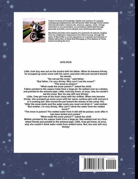 Culture involves all knowledge, beliefs and customs of a people; undergoing enlightenment and refinement often through formal and/or informal education. Cultures die, advance, regress, clash, change, assimilate or are assimilated, are sometimes obliterated through genocide and often survive despite over-whelming adversities. Ray Simm provides some aspects of a spectrum of cultures ranging from his childhood in depression time Hants County through the years of World War 2 to his experience as a teacher and educator in Halifax (Africville),to North End Winnipeg and to First Nations of Turtle Island including the Inuit.