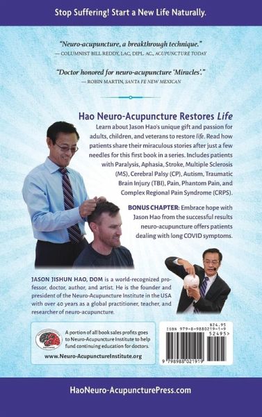 Neuro-Acupuncture Restores Life: A New Treatment is Born to Help Patients Suffering from Neurological Disorders Jason Jishun Hao has a unique gift and sincere passion to help adults, children, and veterans to restore life. Follow his journey to America, and how he envisions his clear purpose of helping others regenerate their lives and educating other professionals to do the same. Each section of this book clearly defines a variety of health challenging conditions patients have been diagnosed with and who might be close to giving up living a full life. Each part offers several personal stories while Jason Hao clearly defines their unique diagnosis, challenge, and recovery. He takes time to answer those frequently asked questions and offers a special space for notes. Readers will enjoy reading this first book in a series. Individuals suffering from ongoing pain or a disability from a significant diagnosis will begin to open their minds to successful possibilities without surgeries or medications to embrace an independent life without crutches, and pain naturally. Medical doctors and Doctors of Oriental Medicine (DOM) will be interested in learning more about how this new treatment called, Neuro-Acupuncture and how it is helping others restore their lives. Jason Hao has been one of the few DOMs who have taken neuro-acupuncture mainstream. He is also an acknowledged artist and has been recognized for his Chinese calligraphy which is beautifully integrated throughout the entire design of the book. Some of these inspiring stories present patients restoring their life miraculously after Jason Hao inserts only a few needles. This is the first book in a series for all to read and it focuses on specific case studies of patients with Paralysis, Aphasia, Stroke, Multiple Scoliosis (MS), Cerebral Palsy (CP), Autism, Traumatic Brain Injury (TBI), Pain, Phantom Pain, and Complex Regional Pain Syndrome (CRPS). BONUS CHAPTER: Embrace hope with Jason Hao who reveals successful results using Hao Neuro-Acupuncture for patients dealing with long COVID symptoms. www.HaoNeuro-AcupuncturePress.com