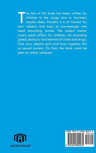 The text of this book has been written for children in the range nine to fourteen, maybe older. Possibly it is of interest for slow readers and boys at pre-teenage who need absorbing stories. The subject matter covers adult affairs for children, not excluding greed, jealousy and mention of crime and drugs. One story depicts girls and boys together. But no sexual content. On that, the book could be seen as rather subdued. there are some who might regard it as slightly old-fashioned.