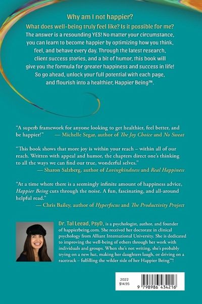 Happier Being: Your Path to Optimizing Habits, Health & Happiness Why am I not happier? What does well-being truly feel like? Can I learn how to be a happier person? The answer is a resounding YES! No matter your circumstance, you can learn to become happier by optimizing how you think, feel, and behave every day. Through the latest research, client success stories, and a bit of humor, this book will give you the formula for greater happiness and success in life! So go ahead, unlock your full potential with each page, live more, and flourish into a healthier, Happier Being(TM). In Happier Being, psychologist Dr. Tal Leead will teach you how to:Recognize what's holding you back from flourishing into your full potential Learn how you can start healing anxiety and depression yourself to feel better Nurture meaningful social connections and relationships - no more loneliness Let go of fear and embrace opportunities for personal and professional growth Develop lasting habits of a happy brain and shape your newer, happier identity Understand the psychological and physical components of happiness to boost your energy Master the fundamental eating, sleeping, and moving practices that work for you Recover from the wounds of hardship, learn about managing chronic stress, illness, pain - and discover tools to help you bounce through major life setbacks. ... And many more tips and exercises to help you reconnect with and optimize your happier self. Through Happier Being, Dr. Tal Leead will be your growth mindset coach, positive thinking guide, habit changer extraordinaire - whatever you want to call it! If you're looking for a mind body reset to energize your life and wellbeing, you've come to the right place! Dr. Tal Leead has helped clients from all walks of life find their Happier Being, and she knows that everyone, no matter what their circumstance or starting point, can too. The answer to finding happiness isn't out there - it's right inside you. When you learn to tap into it, you will become a happier being.