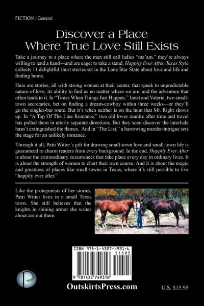 Take a journey to a place where the men still call ladies "ma'am," they're always willing to lend a hand-and are eager to take a stand. Happily Ever After, Texas Style collects 11 delightful short stories set in the Lone Star State about love and life and finding home. Here are stories, all with strong women at their center, that speak to unpredictable nature of love, its ability to find us no matter where we are, and the adventure that often leads to it. In "Times When Things Just Happen," Janet and Valerie, two small-town secretaries, bet on finding a dream-cowboy within three weeks-or they'll go the singles-bar route. But it's when neither is on the hunt that Mr. Right shows up. In "A Top Of The Line Romance," two old loves reunite after time and travel has pulled them in utterly separate directions. But they soon discover the interlude hasn't extinguished the flames. And in "The List," a harrowing murder-intrigue sets the stage for an unlikely romance. Through it all, Patti Witter's gift for drawing small-town love and small-town life is guaranteed to charm readers from every background. In the end, Happily Ever After is about the extraordinary occurrences that take place every day in ordinary lives. It is about the strength of women to chart their own course. And it is about the magic and greatness of places like small towns in Texas, where it's still possible to live "happily ever after."