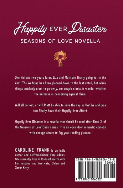 One kid and two years later, Liza and Matt are finally going to tie the knot. The wedding has been planned down to the last detail, but when things suddenly start to go awry, our couple starts to wonder whether the universe is conspiring against them. Will all be lost, or will Matt be able to save the day so that he and Liza can finally have their Happily Ever After? Happily Ever Disaster is a novella that should be read after Book 2 of the Seasons of Love Book series. It is an open-door romantic comedy with enough steam to fog your reading glasses.
