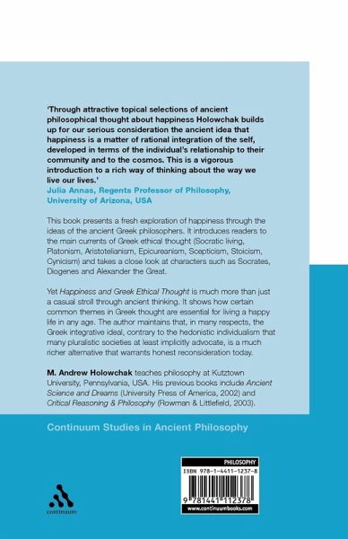 This book presents a fresh exploration of happiness through the ideas of the ancient Greek philosophers. It introduces readers to the main currents of Greek ethical thought (Socratic living, Platonism, Aristotelianism, Epicureanism, Scepticism, Stoicism, Cynicism) and takes a close look at characters such as Socrates, Diogenes and Alexander the Great. Yet Happiness and Greek Ethical Thought is much more than just a casual stroll through ancient thinking. It attempts to show how certain common themes in Greek thought are essential for living a happy life in any age. The author maintains that, in many respects, the Greek integrative ideal, contrary to the hedonistic individualism that many pluralistic societies at least implicitly advocate, is a much richer alternative that warrants honest reconsideration today.