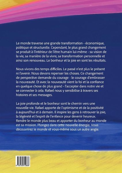 Le monde traverse une grande transformation - économique, politique et structurelle. Cependant, le plus grand changement se produit à l'intérieur de l'être humain lui-même - sa vision de la vie, sa manière de la vivre, sa transformation personnelle et ainsi son renouveau. Le bonheur et la joie en sont les résultats. Nous vivons des temps difficiles. Le passé n'est plus le présent ni l'avenir. Nous devons repenser les choses. Ce changement de perspective demande du courage - le courage d'embrasser la nouveauté. Et avec la nouveauté vient la foi et la confiance en quelque chose de plus grand - l'accepter dans notre vie et se connecter à cela. Rafael nous y sensibilise à travers ses histoires et ses messages. La joie profonde et le bonheur sont le chemin vers une nouvelle vie. Rafael apporte de l'optimisme et de la positivité à aujourd'hui et à demain. Il inspire les gens à retrouver la joie, la légèreté et l'esprit de l'enfance pour devenir heureux. Rendre le monde plus beau et apporter du bonheur au monde est sa mission. Plongez dans cette nouvelle énergie. Vous découvrirez le monde et vous-même sous un autre angle.