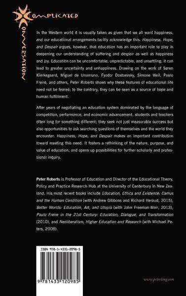 In the Western world it is usually taken as given that we all want happiness, and our educational arrangements tacitly acknowledge this. Happiness, Hope, and Despair argues, however, that education has an important role to play in deepening our understanding of suffering and despair as well as happiness and joy. Education can be uncomfortable, unpredictable, and unsettling; it can lead to greater uncertainty and unhappiness. Drawing on the work of Søren Kierkegaard, Miguel de Unamuno, Fyodor Dostoevsky, Simone Weil, Paulo Freire, and others, Peter Roberts shows why these features of educational life need not be feared; to the contrary, they can be seen as a source of hope and human fulfilment.