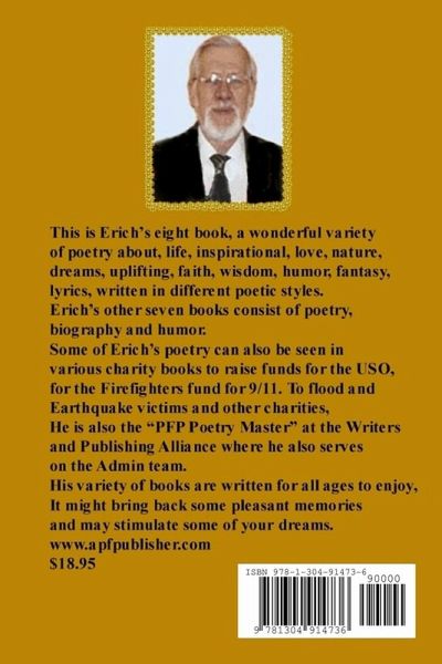 This is Erich's eight book, a wonderful variety of poetry about, life, inspirational, love, nature, dreams, uplifting, faith, wisdom, humor, fantasy, lyrics, written in different poetic styles. Erich's other seven books consist of poetry, biography and humor.