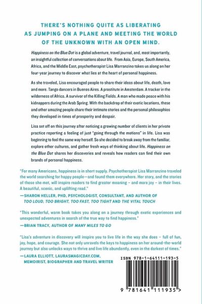 Happiness on the Blue Dot is a global adventure, travel journal, and, most importantly, an insightful collection of conversations about life. From Asia, Europe, South America, Africa, and the Middle East, psychotherapist Lisa Marranzino takes us along on her four-year journey to discover what lies at the heart of personal happiness. As she traveled, Lisa encouraged people to share their ideas about life, death, love and more. Tango dancers in Buenos Aires. A prostitute in Amsterdam. A tracker in the wilderness of Africa. A survivor of the Killing Fields. A man who made peace with his kidnappers during the Arab Spring. With the backdrop of their exotic locations, these and other amazing people share their intimate stories and the personal philosophies they developed in times of prosperity and despair. Lisa set off on this journey after noticing a growing number of clients in her private practice reporting a feeling of just "going through the motions" in life. Lisa was beginning to feel the same way herself. So she decided to break away from the familiar, explore other cultures, and gather fresh ways of thinking about life. Happiness on the Blue Dot shares her discoveries and reveals how readers can find their own brands of personal happiness.