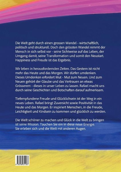 Die Welt geht durch einen grossen Wandel - wirtschaftlich, politisch und strukturell. Doch den grössten Wandel nimmt der Mensch in sich selbst vor - seine Sichtweise auf das Leben, der Umgang damit, seine Transformation und somit den Neustart. Happiness und Freude ist das Ergebnis. Wir leben in herausfordernden Zeiten. Das Gestern ist nicht mehr das Heute und das Morgen. Wir dürfen umdenken. Dieses Umdenken erfordert Mut - Mut zum Neuen. Und zum Neuen gehört der Glaube und das Vertrauen an etwas Grösserem - dieses in unser Leben zu lassen. Rafael macht uns durch seine Geschichten und Botschaften darauf aufmerksam. Tiefempfundene Freude und Glücklichsein ist der Weg in ein neues Leben. Rafael bringt Zuversicht sowie Positivität in das Heute und das Morgen. Er inspiriert Menschen, in die Freude, Leichtigkeit und Kindsein zu kommen und glücklich zu werden. Die Welt schöner zu machen und Glück in die Welt zu bringen ist seine Mission. Tauchen Sie ein in diese neue Energie. Sie erleben sich und die Welt mit anderen Augen.