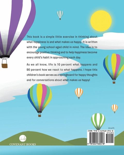 This book is a simple little exercise in thinking about what happiness is and what makes us happy. It is written with the young school-aged child in mind. The idea is to encourage positive thinking and to help happiness become every child's habit in approaching each day. As we all know, life is 10 percent what happens and 90 percent how we react to what happens. I hope this children's book serves as a springboard for happy thoughts and for conversations about what makes us happy!