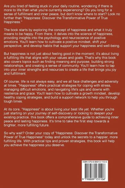 Are you tired of feeling stuck in your daily routine, wondering if there is more to life than what you're currently experiencing? Do you long for a sense of fulfillment and inner peace, but don't know where to start? Look no further than "Happiness: Discover the Transformative Power of True Happiness." The book starts by exploring the concept of happiness and what it truly means to be happy. From there, it delves into the science of happiness, providing insights into the psychology and neuroscience of positive emotions. You'll learn how to cultivate a positive mindset, shift your perspective, and develop habits that support your happiness and well-being. But happiness is not just about feeling good in the moment; it's about living a fulfilling life that aligns with your values and goals. That's why this book also covers topics such as finding meaning and purpose, building strong relationships, and creating a sense of community. You'll learn how to tap into your inner strengths and resources to create a life that brings you joy and fulfillment. Of course, life is not always easy, and we all face challenges and adversity at times. "Happiness" offers practical strategies for coping with stress, managing difficult emotions, and navigating life's ups and downs with resilience and grace. You'll learn how to cultivate a growth mindset, develop healthy coping strategies, and build a support network to help you through tough times. At its core, "Happiness" is about living your best life yet. Whether you're just starting on your journey of self-discovery or looking to deepen your existing practice, this book offers a comprehensive guide to achieving inner peace and lasting happiness. It's time to take the first step towards a brighter, more fulfilling future. So why wait? Order your copy of "Happiness: Discover the Transformative Power of True Happiness" today and unlock the secrets to a happier, more fulfilling life. With practical tips and proven strategies, this book will help you achieve the happiness you deserve.
