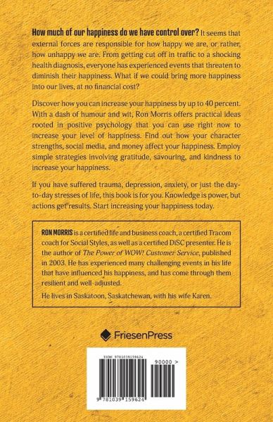 How much of our happiness do we have control over? It seems that external forces are responsible for how happy we are, or rather, how unhappy we are. From getting cut off in traffic to a shocking health diagnosis, everyone has experienced events that threaten to diminish their happiness. What if we could bring more happiness into our lives, at no financial cost? Discover how you can increase your happiness by up to 40 percent. With a dash of humour and wit, Ron Morris offers practical ideas rooted in positive psychology that you can use right now to increase your level of happiness. Find out how your character strengths, social media, and money affect your happiness. Employ simple strategies involving gratitude, savouring, and kindness to increase your happiness. If you have suffered trauma, depression, anxiety, or just the day-to-day stresses of life, this book is for you. Knowledge is power, but actions get results. Start increasing your happiness today.