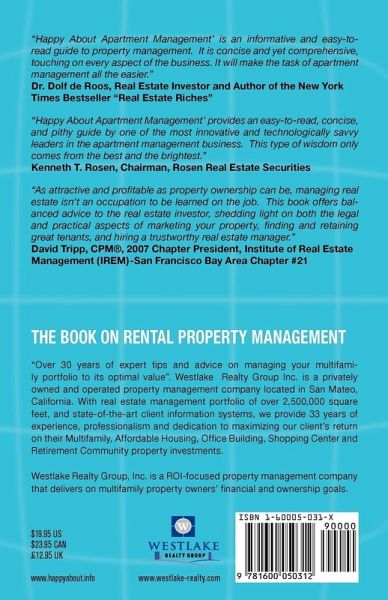 REAL ESTATE can be a smart, lucrative investment, because it shelters property appreciation from taxes while allowing owners to deduct interest and depreciation. In addition, unlike financial investments, tax-deferred exchanges are common real estate trans-actions. However, many investors ignore real estate because it requires daily management. Still others invest in real estate and attempt to manage their properties themselves to save on management fees. Most of us have seen infomercials about achieving financial independence by investing in real estate. During my years in property management, I have seen many people build wealth by investing in real estate. I have also seen time forgive some very poor real-estate investments, because fortunately, most bad real estate decisions are forgiven as property values appreciate. So, from my perspective, the key attribute to successful real estate investing is longevity-surviving the period between purchase and sale, while the property works to pay its way. During the appreciation years, many real estate investors realize how poorly prepared they are to manage property. They experience the enormous stress from evictions because they have not developed appropriate credit-screening techniques that identify potential deadbeats. They are sued for discrimination because they do not understand fair housing regulations. They fall victim to downward economic spirals because they do not understand the relationship between curb appeal, occupancy rates, and rent. Worst of all, they often don't realize that their properties are under-performing by thousands of dollars each month. Westlake Realty Group, has successfully managed real estate for over 30 years. They've dealt with a number of issues discussed above and can help you avoid them. You'll find this book a helpful and informative introduction to the fundamentals-and complexities-of property management.