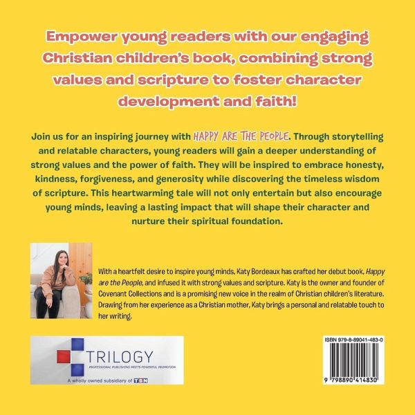 Empower young readers with our engaging Christian children's book, combining strong values and scripture to foster character development and faith! Join us for an inspiring journey with Happy Are the People. Through storytelling and relatable characters, young readers will gain a deeper understanding of strong values and the power of faith. They will be inspired to embrace honesty, kindness, forgiveness, and generosity while discovering the timeless wisdom of scripture. This heartwarming tale will not only entertain but also encourage young minds, leaving a lasting impact that will shape their character and nurture their spiritual foundation.