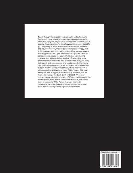 To get through life, to get through struggle, and suffering, to feel better. There is nowhere to go on the Big Ecology of this Earth, but enjoy life, be peaceful, and help self and other that is society. Always stamina for life, always existing, where does life go, the journey of alive? The root of life is stomach and heart, and may you recover, know to blossom in social ecology, with Light, than ego. You begin with ego (ambition, purpose, dream) and may you find the Light, rest in the full Light, the fabric of consciousness, so you see yourself with less fear of going nowhere, less fear of existing, less fear of being, alive is the phenomenon of now of the day, and tomorrow that goes away to the past, and your purpose is to create your destiny, know that destiny is Infinity feel better, you dread the nowhereness, but you must be the Journey of Everywhere, and connect it with Unconditional Love Love Love. Within "Happy Birthday! Being Can Be A Struggle" is Black Go/Stop Forwards, and we must acknowledge the black is not embraced, America is divided, like race left out of quality of life and a white world. The will for power, black power, to face Anti-blackism, and realize there is no door to White Power, forwards clash with backwards, the black and white divided by differences, and black do not have a personal light from other races.