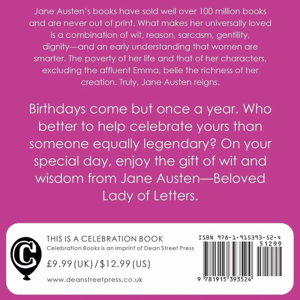 A Birthday Card in Book Form! Features nearly 90 witty and inspirational quotations, and a page for inscribing your personal birthday message. Jane Austen's books have sold well over 100 million books and are never out of print. What makes her universally loved is a combination of wit, reason, sarcasm, gentility, dignity-and an early understanding that women are smarter. The poverty of her life and that of her characters, excluding the affluent Emma, belie the richness of her creation. Truly, Jane Austen reigns. Birthdays come but once a year. Who better to help celebrate yours than someone equally legendary? On your special day, enjoy the gift of wit and wisdom from Jane Austen-Beloved Lady of Letters.
