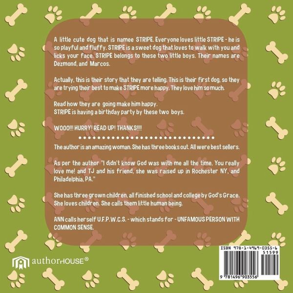 A little cute dog that is namee STRIPE. Everyone loves little STRIPE - he is so playful and fluffy. STRIPE is a sweet dog that loves to walk with you and licks your face. STRIPE belongs to these two little boys. Their names are Dezmond, and Marcos. Actually, this is their story that they are telling. This is their first dog, so they are trying their best to make STRIPE more happy. They love him so much. Read how they are going make him happy. STRIPE is having a birthday party by these two boys. WOOO!!! HURRY! READ UP! THANKS!!!!