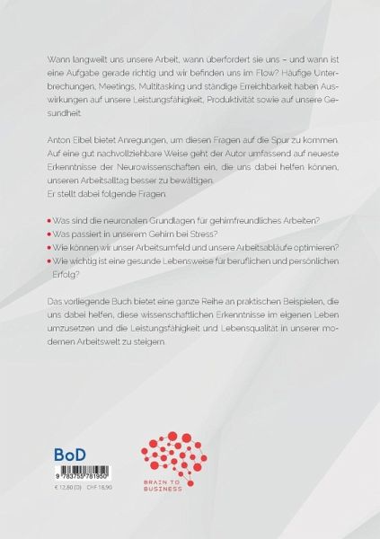 Wann langweilt uns unsere Arbeit, wann überfordert sie uns - und wann ist eine Aufgabe gerade richtig und wir befinden uns im Flow? Häufige Unterbrechungen, Meetings, Multitasking und ständige Erreichbarkeit haben Auswirkungen auf unsere Leistungsfähigkeit, Produktivität sowie auf unsere Gesundheit.Anton Eibel bietet Anregungen, um diesen Fragen auf die Spur zu kommen. Auf eine gut nachvollziehbare Weise geht der Autor umfassend auf neueste Erkenntnisse der Neurowissenschaften ein, die uns dabei helfen können, unseren Arbeitsalltag besser zu bewältigen. Er stellt dabei folgende Fragen:-Was sind die neuronale Grundlagen für gehirnfreundliches Arbeiten?-Was passiert in unserem Gehirn bei Stress?-Wie können wir unser Arbeitsumfeld und unsere Arbeitsabläufe optimieren?-Wie wichtig ist eine gesunde Lebensweise für beruflichen und persönlichen Erfolg? Das vorliegende Buch bietet eine ganze Reihe an praktischen Beispielen, die uns dabei helfen, diese wissenschaftlichen Erkenntnisse im eigenen Leben umzusetzen und die Leistungsfähigkeit und Lebensqualität in unserer modernen Arbeitswelt zu steigern.