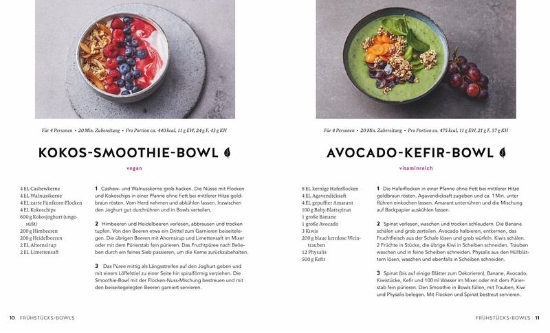 Egal ob fruchtig, süß oder sättigend, die bunten Bowls, die einen gesunden Start in den Tag versprechen, überzeugen mit hervorragendem Geschmack und viel Alltagstauglichkeit. So kann man einige Komponenten, wie zum Beispiel das Topping schon am Vorabend zubereiten und dann nur noch mit frischen Früchten toppen. Basis sind häufig verschiedenen Getreidesorten, die mal vegan, mal vegetarisch kombiniert werden. Dabei wird größtenteils auf raffinierten Zucker verzichtet. Vollen Genuss versprechen zum Beispiel: