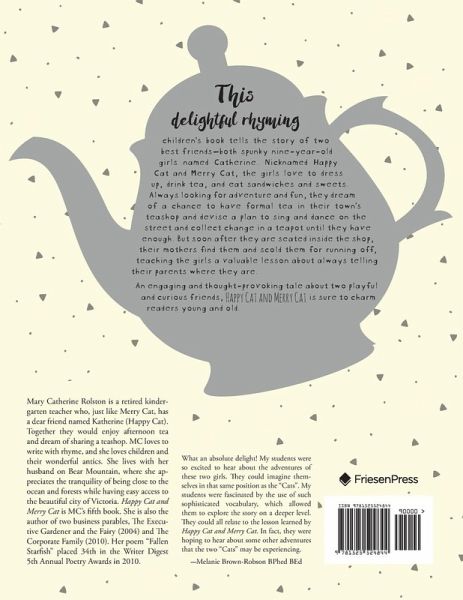This delightful rhyming children's book tells the story of two best friends-both spunky nine-year-old girls named Catherine. Nicknamed Happy Cat and Merry Cat, the girls love to dress up, drink tea, and eat sandwiches and sweets. Always looking for adventure and fun, they dream of a chance to have formal tea in their town's teashop and devise a plan to sing and dance on the street and collect change in a teapot until they have enough. But soon after they are seated inside the shop, their mothers find them and scold them for running off, teaching the girls a valuable lesson about always telling their parents where they are. An engaging and thought-provoking tale about two playful and curious friends, Happy Cat and Merry Cat is sure to charm readers young and old.