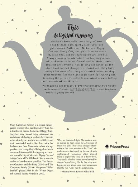 This delightful rhyming children's book tells the story of two best friends-both spunky nine-year-old girls named Catherine. Nicknamed Happy Cat and Merry Cat, the girls love to dress up, drink tea, and eat sandwiches and sweets. Always looking for adventure and fun, they dream of a chance to have formal tea in their town's teashop and devise a plan to sing and dance on the street and collect change in a teapot until they have enough. But soon after they are seated inside the shop, their mothers find them and scold them for running off, teaching the girls a valuable lesson about always telling their parents where they are. An engaging and thought-provoking tale about two playful and curious friends, Happy Cat and Merry Cat is sure to charm readers young and old.