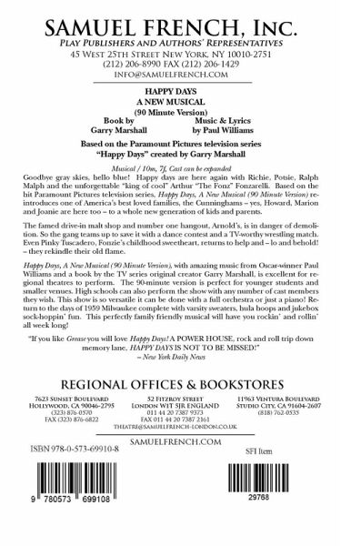 MusicalCharacters: 10 male, 7 female, Cast can be expanded for large groupsThis abridged, 90-minute version, is perfect for school groups.Goodbye gray skies, hello blue! Happy days are here again with Richie, Potsie, Ralph Malph and the unforgettable "king of cool" Arthur "The Fonz" Fonzarelli. Based on the hit Paramount Pictures television series, Happy Days, A New Musical reintroduces one of America's best loved families, the Cunninghams -- yes, Howard,
