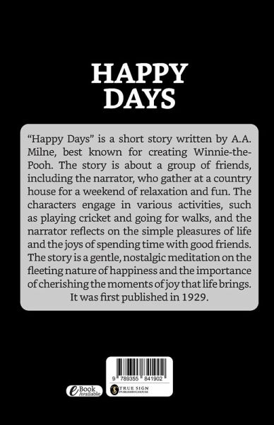 "Happy Days" is a short story written by A.A. Milne, best known for creating Winnie-the-Pooh. The story is about a group of friends, including the narrator, who gather at a country house for a weekend of relaxation and fun. The characters engage in various activities, such as playing cricket and going for walks, and the narrator reflects on the simple pleasures of life and the joys of spending time with good friends. The story is a gentle, nostalgic meditation on the fleeting nature of happiness and the importance of cherishing the moments of joy that life brings. It was first published in 1929.