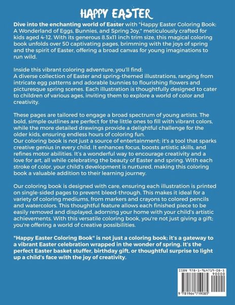 Dive into the enchanting world of Easter with "Happy Easter Coloring Book: A Wonderland of Eggs, Bunnies, and Spring Joy," meticulously crafted for kids aged 4-12. With its generous 8.5x11 inch trim size, this magical coloring book unfolds over 50 captivating pages, brimming with the joys of spring and the spirit of Easter, offering a broad canvas for young imaginations to run wild. Inside this vibrant coloring adventure, you'll find:A diverse collection of Easter and spring-themed illustrations, ranging from intricate egg patterns and adorable bunnies to flourishing flowers and picturesque spring scenes. Each illustration is thoughtfully designed to cater to children of various ages, inviting them to explore a world of color and creativity. Pages tailored to engage a broad spectrum of young artists. The bold, simple outlines are perfect for the little ones to fill with vibrant colors, while the more detailed drawings provide a delightful challenge for the older kids, ensuring endless hours of coloring fun. A perfect blend of entertainment and educational benefits, this coloring book sparks the creative genius in every child, enhances focus, boosts artistic skills, and refines motor abilities. It's a beautiful way to encourage creativity and a love for art while celebrating the beauty of Easter and spring. Designed carefully, each illustration is printed on single-sided pages to prevent bleed-through, making it ideal for various coloring mediums, from markers and crayons to colored pencils and watercolors. This thoughtful feature allows each finished piece to be easily removed and displayed, adorning your home with your child's artistic achievements. "Happy Easter Coloring Book" is not just a coloring book; it's a gateway to a vibrant Easter celebration wrapped in the wonder of spring. It's the perfect Easter basket stuffer, birthday gift, or thoughtful surprise to light up a child's face with the joy of creativity. Embrace the season of new beginnings and joy with an 8.5x11-inch coloring book that provides ample space for creativity and fun. Grab your copy of the "Happy Easter Coloring Book" today, and let your child's Easter journey be filled with color, joy, and the magic of imagination!