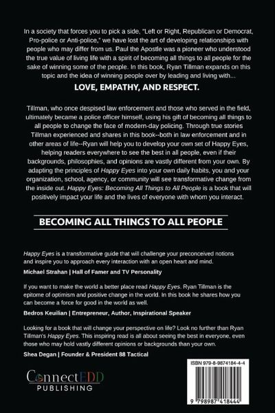 In a society that forces you to pick a side, "Left or Right, Republican or Democrat, Pro-police or Anti-police," we have lost the art of developing relationships with people who may differ from us. Paul the Apostle was a pioneer who understood the true value of living life with a spirit of becoming all things to all people for the sake of winning some of the people. In this book, Ryan Tillman expands on this topic and the idea of winning people over by leading and living with love, empathy, and respect. Tillman, who once despised law enforcement and those who served in the field, ultimately became a police officer himself, using his gift of becoming all things to all people to change the face of modern-day policing. Through true stories Tillman experienced and shares in this book--both in law enforcement and in other areas of life--Ryan will help you to develop your own set of Happy Eyes, helping readers everywhere to see the best in all people, even if their backgrounds, philosophies, and opinions are vastly different from your own. By adapting the principles of Happy Eyes into your own daily habits, you and your organization, school, agency, or community will see transformative change from the inside out. Happy Eyes: Becoming All Things to All People is a book that will positively impact your life and the lives of everyone with whom you interact.