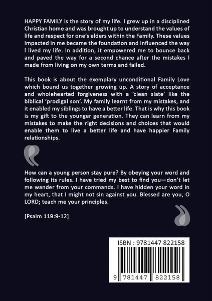HAPPY FAMILY is the story of my life. I grew up in a disciplined Christian home and was brought up to understand the values of life and respect for one's elders within the Family. These values impacted in me became the foundation and influenced the way l lived my life. In addition, it empowered me to bounce back and paved the way for a second chance after the mistakes l made from living on my own terms and failed. This book is about the exemplary unconditional Family Love which bound us together growing up. A story of acceptance and wholehearted forgiveness with a 'clean slate' like the biblical 'prodigal son'. My family learnt from my mistakes, and it enabled my siblings to have a better life. That is why this book is my gift to the younger generation. They can learn from my mistakes to make the right decisions and choices that would enable them to live a better life and have happier Family relationships.