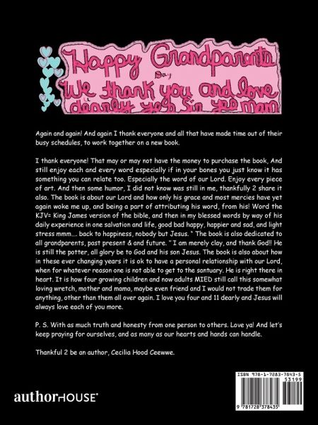 Again and again! And again I thank everyone and all that have made time out of their busy schedules, to work together on a new book. I thank everyone! That may or may not have the money to purchase the book, And still enjoy each and every word especially if in your bones you just know it has something you can relate too. Especially the word of our Lord. Enjoy every piece of art. And then some humor, I did not know was still in me, thankfully 2 share it also. The book is about our Lord and how only his grace and most mercies have yet again woke me up, and being a part of attributing his word, from his! Word the KJV= King James version of the bible, and then in my blessed words by way of his daily experience in one salvation and life, good bad happy, happier and sad, and light stress mmm.... back to happiness, nobody but Jesus. " The book is also dedicated to all grandparents, past present & and future. '' I am merely clay, and thank God!! He is still the potter, all glory be to God and his son Jesus. The book is also about how in these ever changing years it is ok to have a personal relationship with our Lord, when for whatever reason one is not able to get to the santuary. He is right there in heart. It is how four growing children and now adults MIED still call this somewhat loving wretch, mother and mama, maybe even friend and I would not trade them for anything, other than them all over again. I love you four and 11 dearly and Jesus will always love each of you more. P. S. With as much truth and honesty from one person to others. Love ya! And let's keep praying for ourselves, and as many as our hearts and hands can handle. Thankful 2 be an author, Cecilia Hood Ceewwe.