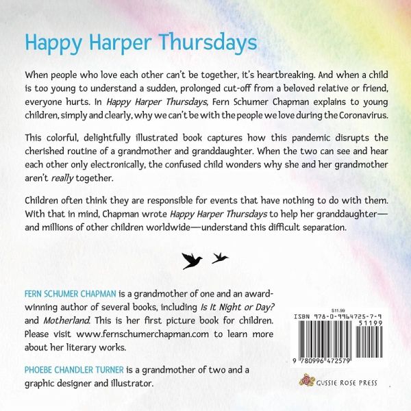 When people who love each other can't be together, it's heartbreaking. And when a child is too young to understand a sudden, prolonged cut-off from a beloved relative or friend, everyone hurts. In Happy Harper Thursdays, Fern Schumer Chapman explains to young children, simply and clearly, why we can't be with the people we love during the pandemic. This colorful, delightfully illustrated book captures how this pandemic disrupts the cherished routine of a grandmother and granddaughter. When the two can see and hear each other only electronically, the confused child wonders why she and her grandmother aren't really together. Children often think they are responsible for events that have nothing to do with them. With that in mind, Chapman wrote Happy Harper Thursdaysto help her granddaughter-- and millions of other children worldwide-- understand this difficult separation.