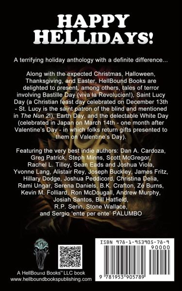A terrifying holiday anthology with a definite difference... Along with the expected Christmas, Halloween, Thanksgiving, and Easter, HellBound Books are delighted to present, among others, tales of terror involving Bastille Day (viva la Revolucion!), Saint Lucy Day (a Christian feast day celebrated on December 13th - St. Lucy is the saint patron of the blind and mentioned in The Nun 2!), Earth Day, and the delectable White Day (celebrated in Japan on March 14th - one month after Valentine's Day - in which folks return gifts presented to them on Valentine's Day). Featuring the very best indie authors: Dan A. Cardoza, Greg Patrick, Steph Minns, Scott McGregor, Rachel L. Tilley, Sean Eads and Joshua Viola, Yvonne Lang, Alistair Rey, Joseph Buckley, James Fritz, Hillary Dodge, Joshua Peddicord, Christina Delia, Rami Ungar, Serena Daniels, B.K. Crafton, Zé Burns, Kevin M. Folliard, Ron McDougall, Andrew Murphy, Josiah Santos, Bill Hatfield, R.P. Serin, Stone Wallace, and Sergio 'ente per ente' PALUMBO