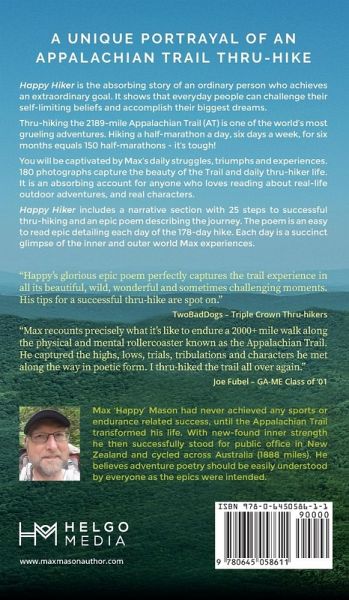 A UNIQUE PORTRAYAL OF THE APPALACHIAN TRAIL Happy Hiker: The epic journey of an unlikely Appalachian Trail thru-hiker is an entertaining story of an ordinary person who achieves an extraordinary accomplishment. It is a guide showing how everyday people can challenge their self-limiting beliefs and achieve their biggest dreams. Thru-hiking the full 2190-mile Appalachian Trail (AT) is one of the world's most grueling adventures. Hiking a half-marathon a day, six days a week, for six months equals 150 half-marathons - it's tough! Prior to the AT, Max Mason (trail name "Happy") had never achieved…mehr
