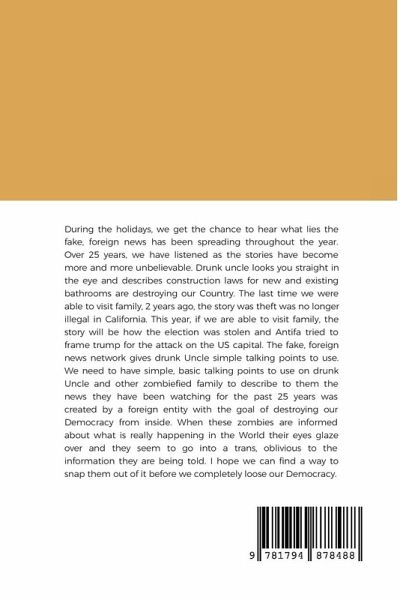 During the holidays, we get the chance to hear what lies the fake, foreign news has been spreading throughout the year. Over 25 years, we have listened as the stories become more and more unbelievable. Drunk uncle looks you straight in the eye and describes construction laws for new and existing bathrooms are destroying our Country. The last time we were able to visit family, 2 years ago, the story was theft was no longer illegal in California. This year, if we are able to visit family, the story will be how the election was stolen and Antifa tried to frame trump for the attack on the US capital. The fake, foreign news network gives drunk Uncle simple talking points to use. We need to have simple, basic talking points to use on drunk Uncle and other zombiefied family to show them the news they have been watching for the past 25 years was created by a foreign entity with the goal of destroying our Democracy from inside. When these zombies are informed about what is really happening in the World their eyes glaze over and they seem to go into a trans, oblivious to the information they are being told. I hope we can find a way to snap them out of it before we completely loose our Democracy.