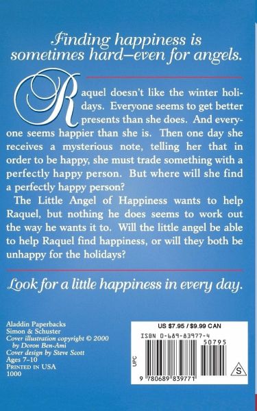 Finding happiness is sometimes hard -- even for angels. Raquel doesn't like the winter holidays. Everyone seems to get better presents than she does. And everyone seems happier than she is. Then one day she receives a mysterious note, telling her that in order to be happy, she must trade something with a perfectly happy person. But where will she find a perfectly happy person? The Little Angel of Happiness wants to help Raquel, but nothing he does seems to work out the way he wants it to. Will the little angel be able to help Raquel find happiness, or will they both be unhappy for the holidays? Look for a little happiness in every day.