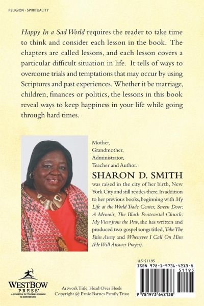 Happy In a Sad World requires the reader to take time to think and consider each lesson in the book. The chapters are called lessons, and each lesson covers a particular difficult situation in life. It tells of ways to overcome trials and temptations that may occur by using Scriptures and past experiences. Whether it be marriage, children, finances or politics, the lessons in this book reveal ways to keep happiness in your life while going through hard times.