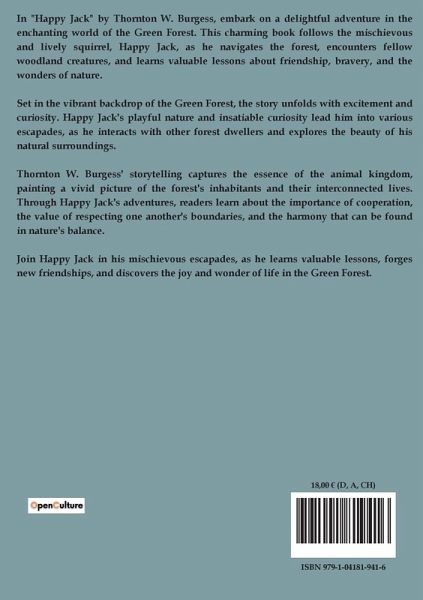 In "Happy Jack" by Thornton W. Burgess, embark on a delightful adventure in the enchanting world of the Green Forest. This charming book follows the mischievous and lively squirrel, Happy Jack, as he navigates the forest, encounters fellow woodland creatures, and learns valuable lessons about friendship, bravery, and the wonders of nature. Set in the vibrant backdrop of the Green Forest, the story unfolds with excitement and curiosity. Happy Jack's playful nature and insatiable curiosity lead him into various escapades, as he interacts with other forest dwellers and explores the beauty of his natural surroundings. Thornton W. Burgess' storytelling captures the essence of the animal kingdom, painting a vivid picture of the forest's inhabitants and their interconnected lives. Through Happy Jack's adventures, readers learn about the importance of cooperation, the value of respecting one another's boundaries, and the harmony that can be found in nature's balance. Join Happy Jack in his mischievous escapades, as he learns valuable lessons, forges new friendships, and discovers the joy and wonder of life in the Green Forest.