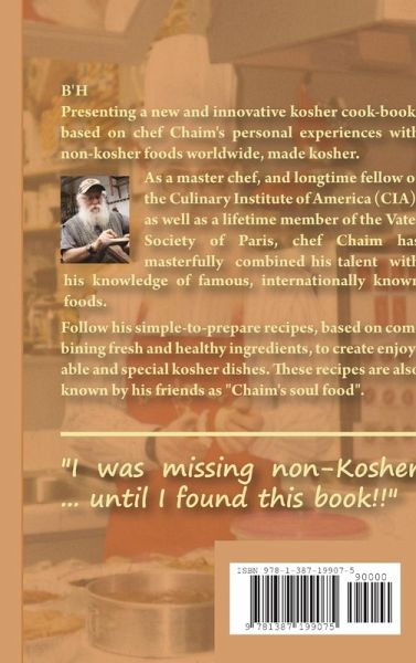 Presenting a new and innovative kosher cook-book, based on chef Chaim's personal experiences with non-kosher foods worldwide, made kosher. As a master chef, and longtime fellow of the Culinary Institute of America (CIA), as well as a lifetime member of the Vatel Society of Paris, chef Chaim has masterfully combined his talent with his knowledge of famous, internationally known, foods. Follow his simple-to-prepare recipes, based on combining fresh and healthy ingredients, to create enjoyable and special kosher dishes. These recipes are also known by his friends as "Chaim's soul food". "I was missing non-Kosher ... until I found this book!!"