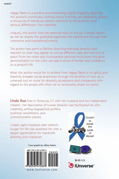 Happy Pants is a positive and motivating original biography depicting the author's unorthodox clothing choice. It briefly, yet delightfully shares a minuscule of individuals diverse reactions to the authors most obvious differences-her wardrobe. Uniquely, the author links her personal style to the joy it brings others as well as shares the gratifying happiness she experiences through their comments and inspirational events. The author has spent a lifetime observing individual behavior and reaction to what may appear to one as different, odd, and even out of place. From her notes and incomparable personal encounters she gives demonstration to how color can add a sense of wonder and confidence to a person's life. What the author would like to achieve from Happy Pants is to lightly and blissfully broaden social awareness through the benefits of color as a universal tool en route for diversity acceptance and compassion with regard to the people with whom we so necessarily share our world.