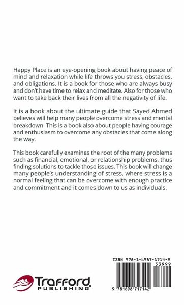 Happy Place is an eye-opening book about having peace of mind and relaxation while life throws you stress, obstacles, and obligations. It is a book for those who are always busy and don't have time to relax and meditate. Also for those who want to take back their lives from all the negativity of life. It is a book about the ultimate guide that Sayed Ahmed believes will help many people overcome stress and mental breakdown. This is a book also about people having courage and enthusiasm to overcome any obstacles that come along the way. This book carefully examines the root of the many problems such as financial, emotional, or relationship problems, thus finding solutions to tackle those issues. This book will change many people's understanding of stress, where stress is a normal feeling that can be overcome with enough practice and commitment and it comes down to us as individuals.