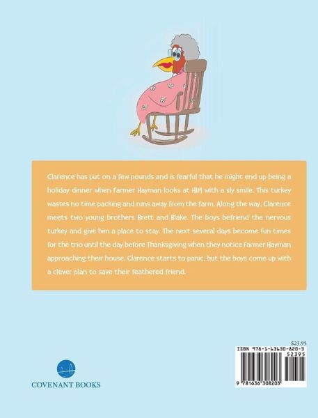 Clarence has put on a few pounds and is fearful that he might end up being a holiday dinner when Farmer Hayman looks at HIM with a sly smile. This turkey wastes no time packing and runs away from the farm. Along the way, Clarence meets two young brothers Brett and Blake. The boys befriend the nervous turkey and give him a place to stay. The next several days become fun times for the trio until the day before Thanksgiving when they notice Farmer Hayman approaching their house. Clarence starts to panic, but the boys come up with a clever plan to save their feathered friend.