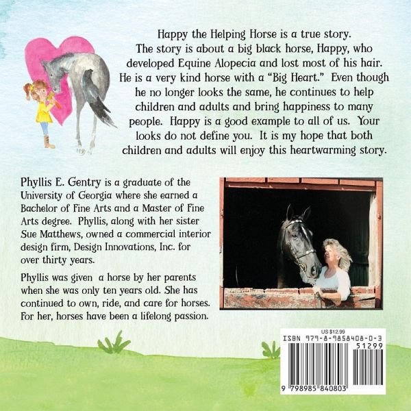 A heartwarming true story about a big horse with an even bigger heart. Happy the Helping Horse has an important message for kids and adults alike - you are so much more than your looks! This real-life story is about a big black horse (Happy) who developed equine alopecia and lost most of his hair. Even though he no longer looked the same, he refused to let that make him feel bad. Instead, he continued to spread joy by helping children and adults with his big heart and loving kindness. Happy is a good example to all of us. Your looks do not define you. Children will learn:To accept themselves - exactly as they are To be open and accepting of others who are different The more you give, the better life you and others will live! Grab your copy of Happy the Helping Horse - a story that both children and adults will enjoy reading over and over again.
