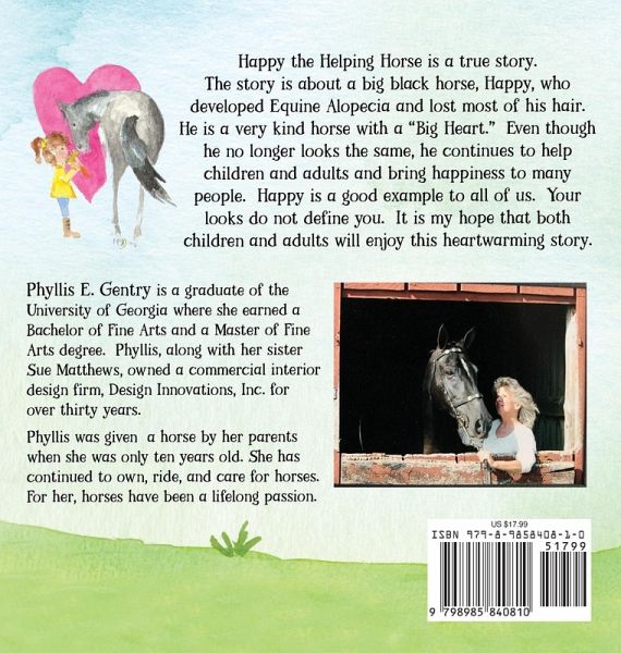A heartwarming true story about a big horse with an even bigger heart. Happy the Helping Horse has an important message for kids and adults alike - you are so much more than your looks! This real-life story is about a big black horse (Happy) who developed equine alopecia and lost most of his hair. Even though he no longer looked the same, he refused to let that make him feel bad. Instead, he continued to spread joy by helping children and adults with his big heart and loving kindness. Happy is a good example to all of us. Your looks do not define you. Children will learn:To accept themselves - exactly as they are To be open and accepting of others who are different The more you give, the better life you and others will live! Grab your copy of Happy the Helping Horse - a story that both children and adults will enjoy reading over and over again.