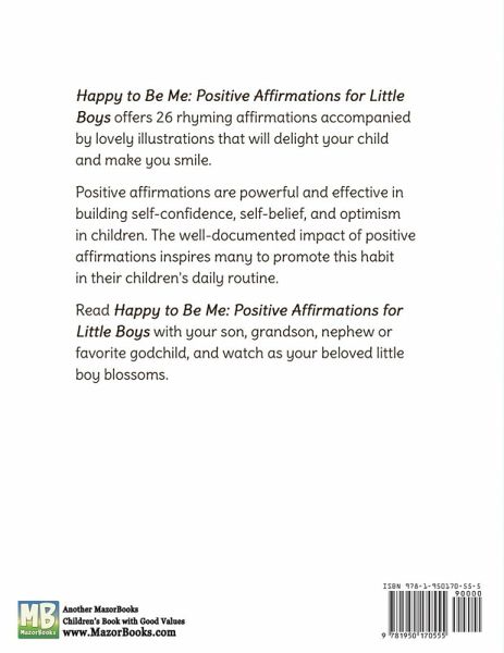 The children's book Happy to Be Me: Positive Affirmations for Little Boys consists of 26 positive affirmations based on the 26 letters of the alphabet. Each affirmation is expressed in rhyme and is accompanied by a lovely illustration that is bound to delight your child and make you smile. Positive affirmations are the powerful, holistic, and incredibly effective method of building a confident and optimistic mind and of nurturing self-belief in children. This well-documented effect of positive affirmations should inspire every parent to introduce this exercise into their child's routine. Read Happy to Be Me: Positive Affirmations for Little Boys with your son, grandson, nephew or favorite godchild, and see the beloved little boys in your life blossom. Also available: Happy to Be Me: Positive Affirmations for Little Girls and Happy to Be Me: Positive Affirmations for Little Kids (the combined version).