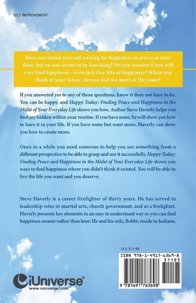 Have you found yourself waiting for happiness to arrive at your door, but no one seems to be knocking? Do you wonder if you will ever find happiness-even just tiny bits of happiness? When you think of your future, do you just see more of the same? If you answered yes to any of those questions, know it does not have to be. You can be happy, and Happy Today: Finding Peace and Happiness in the Midst of Your Everyday Life shows you how. Author Steve Haverly helps you find joy hidden within your routine. If you have none, he will show you how to have it in your life. If you have some but want more, Haverly can show you how to create more. Once in a while you need someone to help you see something from a different perspective to be able to grasp and use it successfully. Happy Today: Finding Peace and Happiness in the Midst of Your Everyday Life shows you ways to find happiness where you didn't think it existed. You will be able to live the life you want and you deserve.