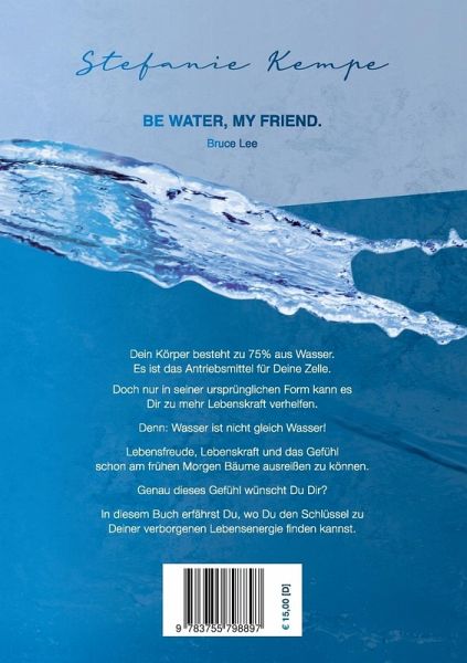 Be Water, my Friend. - Bruce LeeDein Körper besteht zu 75% aus Wasser.Es ist das Antriebmittel Deiner Zelle.Doch nur in seiner ursprünglichen Form kann es Dir zu mehr Lebenskraft verhelfen!Denn: Wasser ist nicht gleich Wasser.So viel sei verraten: Die Eigenschaften "sauber" & "schmeckt schon" reichen nicht aus um unseren Körper mit dem Lebenselixier zu versorgen. Wir begeben uns auf eine molekulare Reise ohne Hokuspokus mit dem Ziel Lebensfreude, Lebenskraft und das Gefühl schon am frühen Morgen Bäume ausreißen zu können wieder zu erwecken.In diesem Buch erfährst Du mit Charme und Expertise, wo Du den Schlüssel zu Deiner verborgenen Lebensenergie finden kannst.