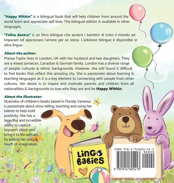 Felice dentro è un libro bilingue che aiuterà i bambini di tutto il mondo ad imparare ed apprezzare l¿amore per se stessi e abbraccia la diversità. L¿edizione bilingue è disponible in varie altre lingue. . Happy within is a bilingual children's book that will help children from around the world learn, appreciate self-love and embrace diversity. A positive children's book in English & Italian teaching them that self-love is the key to true happiness. The book includes a diverse range of characters with the message that we should all love ourselves and support one another to be the best we can be. An excellent resource for first conversations around race & diversity. DETAILS: * An excellent bilingual resource for kids to teach & learn Italian * Great bilingual kids book for bilingual families who speak Italian and/or English at home * Ideal for kids ages of 3 4 5 6 7 * A fantastic children's bilingual Italian book for preschools, teachers & educators in English speaking countries. * A fantastic resource for preschools, teachers & educators with Italian as part of their curriculum * 30+ pages of diverse and fun illustrations to get the interest of little children. * An excellent way for kids to learn first words in English & Italian to help develop your child's bilingual ability. * The pages with diverse and inclusive characters give parents, caregivers and educators the opportunity to talk to children about multiculturalism * Bright and colourful illustrations to keep children engaged & help learn Italian. * Perfect for traveling, homeschool activities, gifts for bilingual families, etc. * An excellent resources for first conversations about race & diversity * Positive Affirmations: An excellent resources to help build self-esteem and self-confidence in kids The idea behind our bilingual books is to create diverse resources that help encourage children to learn a second language, while celebrating diversity and multiculturalism. To stay up to date on new releases follow us via @lingobabies