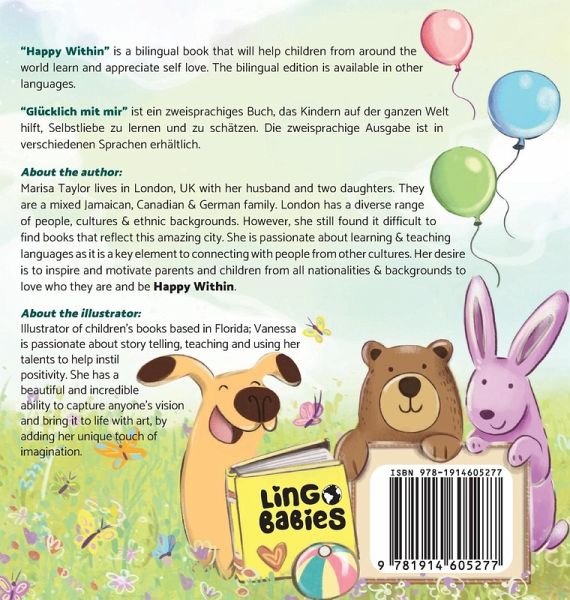 Ein zweisprachiges Kinderbuch (Englisch- Deutsch) Glücklich mit mir ist ein zweisprachiges Bilderbuch, das Kindern auf der ganzen Welt hilft, Selbstliebe zu lernen und zu schätzen. Die Idee hinter dem Bilderbuch ist, Kindern die Unterstützung und das Selbstvertrauen zu geben, mit sich selbst und in ihrer eigenen Haut glücklich zu sein. Egal wo auf der Welt man herkommt...Dieses zweisprachige Kinderbuch ist auf Englisch und Deutsch geschrieben und enthält eine Vielzahl von Charakteren mit der Botschaft, dass wir uns alle lieben und uns gegenseitig unterstützen sollten, um das schöne zu sein, das in uns steckt. Es ist ein positives vielfältiges Kinderbuch, das Kindern hilft, Selbstliebe zu lernen und zu schätzen, denn jedes Kind ist auf seine besondere Art und Weise einzigartig. Nur mit Selbstliebe ist man wirklich glücklich. Die zweisprachige Versionen dieses Buches sollen Kindern/Eltern helfen, gemeinsam eine andere Sprache zu lernen. Das perfekte Kinderbuch und Geschenk zum Thema Diversität! Die zweisprachige Ausgabe ist in verschiedenen Sprachen erhältlich.Wenn Sie dieses Buch in anderen Sprachen sehen möchten, und die gewünschte Sprache nicht verfügbar ist, können Sie mich über IG @lingobabies anschreiben. Dieses Buch ist für Kinder ab 3 Jahre alt geeignet. *****BUCH AUSZEICHNUNGEN2022 International Book Awards FINALIST A bilingual children's book (English German) Happy within is a bilingual children's picture book that will help children from around the world learn, appreciate self-love and embrace diversity. The message of the bilingual kids book is to help provide children with the support and confidence to be happy with themselves and within their own skin. No matter where in the world they are from, whether the race, the background, etc. The kids book is written in both English and German and includes a diverse range of characters with the message that we should all love ourselves and support one another to be the best we can be. It is a positive bilingual book for kids teaching them to be proud of themselves, proud of who they are and of their uniqueness. Only through self-love and believing in oneself it is possible to be happy within. If you would like to see this book in other languages that are not available please contact me via IG @lingobabies . This book is ideal for children between the ages of 3-6. With this bilingual book they will learn: * About the beauty of diversity * That happiness comes from self-love * Basic vocabulary in English & German * Positive affirmations in English & German Details: * Ideal for kids ages 3 4 5 6 * A fantastic resource for pre-schools, kindergarten, teachers & educators with German as part of their curriculum * For kids whose first language isn't German * The perfect resource for bilingual teachers works in bilingual German preschools, bilingual kindergartens * 25+ pages of diverse and fun illustrations to get the interest of little children. * A bilingual picture book with side by side text in English & German to help develop your child's bilingual ability. * The pages with diverse and inclusive characters give parents, caregivers and educators the opportunity to talk to children about multiculturalism.