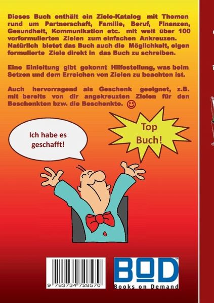 Eine einfache Anleitung zum glücklich sein. Dieses Buch enthält ein Ziele-Katalog mit Themen rund um Partnerschaft, Familie, Beruf, Finanzen, Gesundheit, Kommunikation etc. mit weit über 100 vorformulierten Zielen zum einfachen Ankreuzen. Natürlich bietet das Buch auch die Möglichkeit, eigen formulierte Ziele direkt in das Buch zu schreiben.Eine Einleitung gibt gekonnt Hilfestellung, was beim Setzen und dem Erreichen von Zielen zu beachten ist.Auch hervorragend als Geschenk geeignet, z.B. mit bereits von dir angekreuzten Zielen für den Beschenkten bzw. die Beschenkte. :-)